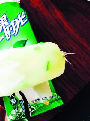 許先生說:“那天下午兩點(diǎn)多,我去超市買了6個(gè)宏寶萊的鮮果時(shí)光雪糕,回家后我和父母每人吃了一個(gè),而我的那個(gè)雪糕沒吃幾口就咬到一個(gè)硬物。我以為是椰果,便用力咬了一下,卻發(fā)現(xiàn)根本咬不動(dòng),低頭一看,發(fā)現(xiàn)雪糕里露出一塊塑料布。因?yàn)槲矣昧σВ@塊塑料布已被拽出一部分,還有一部分凍在里面?!庇浾呖吹皆S先生拿出的雪糕上半部分露出了兩塊塑料布。