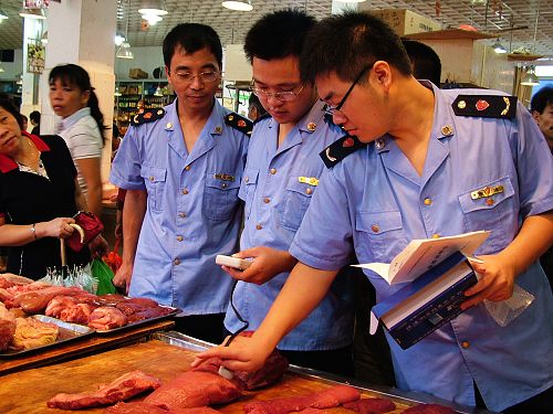 隨后,記者向食藥監(jiān)部門反映此事,當日14時許,??谑协偵絽^(qū)中山食品藥品監(jiān)督管理所執(zhí)法人員趕到現場。執(zhí)法人員用手摸了摸攤位上的牛肉,并沒有立即做出判斷。“是不是注水牛肉,通??梢杂檬置纯答げ火な?,但這不能作為執(zhí)法的依據?!眻?zhí)法人員隨即聯系了瓊山區(qū)食品藥品監(jiān)督管理局有關負責人,詢問是否可以用食品快檢車檢測注水肉,得到的答復是“暫時不可以”。該執(zhí)法人員稱,目前海口食藥監(jiān)部門正計劃引進一種可以快速檢測注水肉的儀器CSY-R肉類水分測定儀,待儀器配備到位后,他們將對培龍市場的所有鮮肉攤進行檢測,排除隱患。
